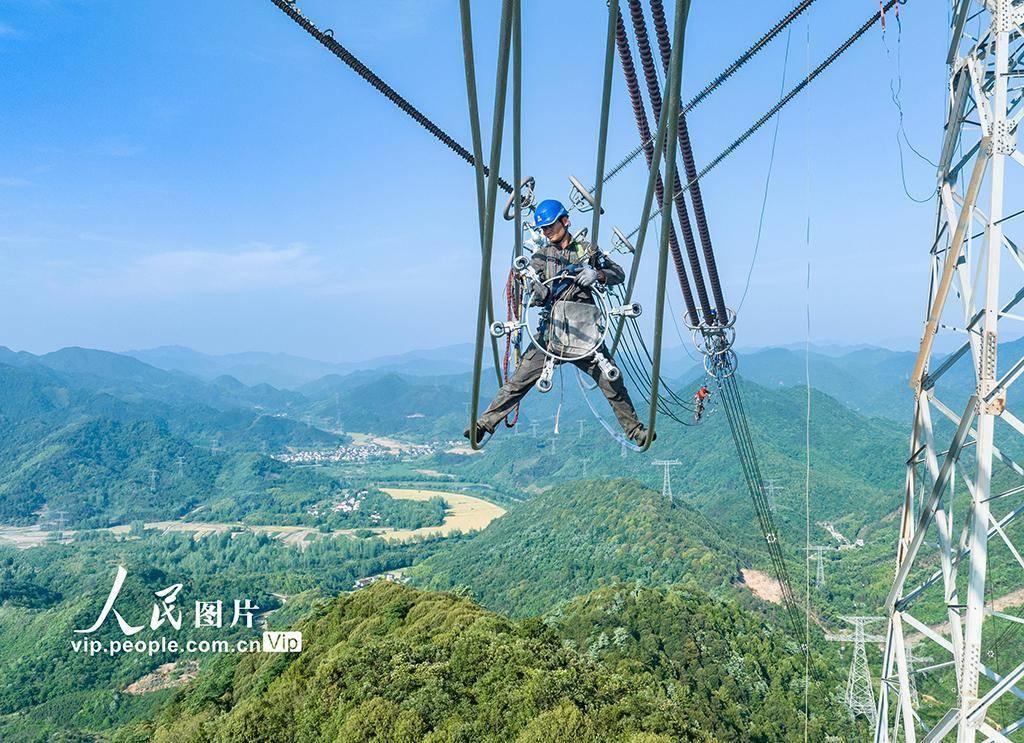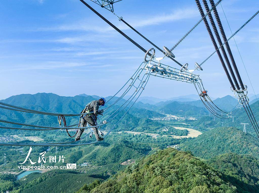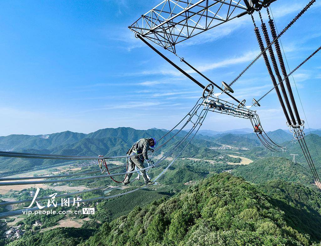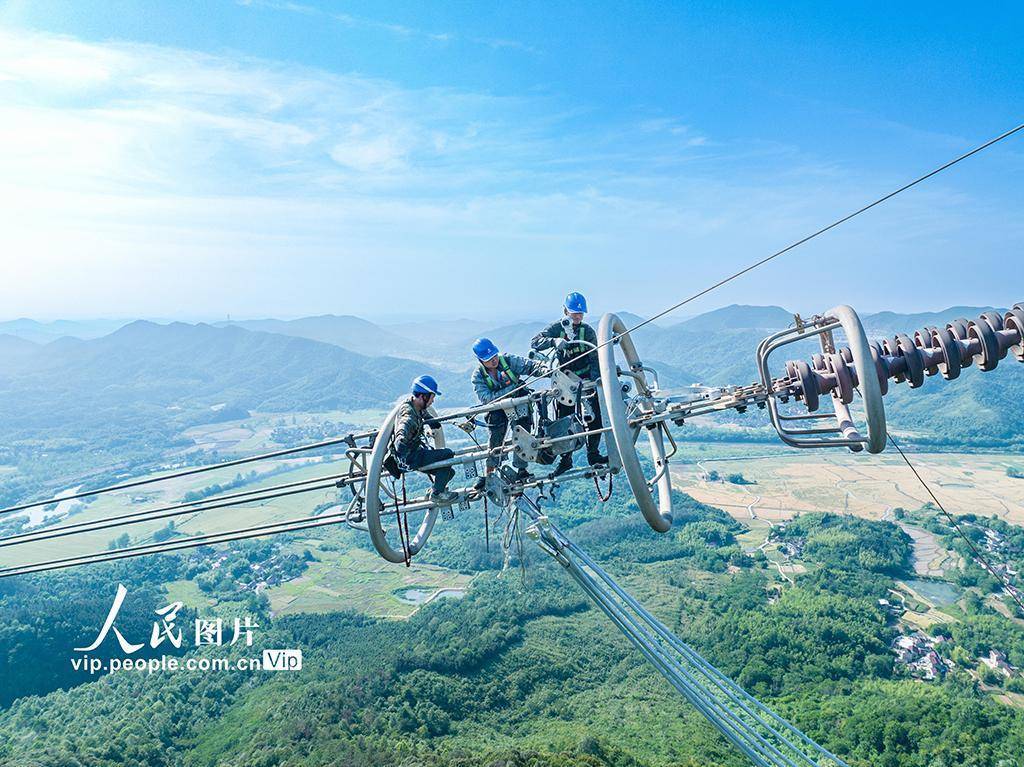 2025年5月12日,在安徽省池州市贵池区殷汇镇±800千伏锦苏特高压直流输电线路检修现场,国网池州供电公司组织施工人员开展高空线路设备检修作业,全力保障"西电东送"特高压输电通道安全稳定运行。贾万田摄(人民图片网)